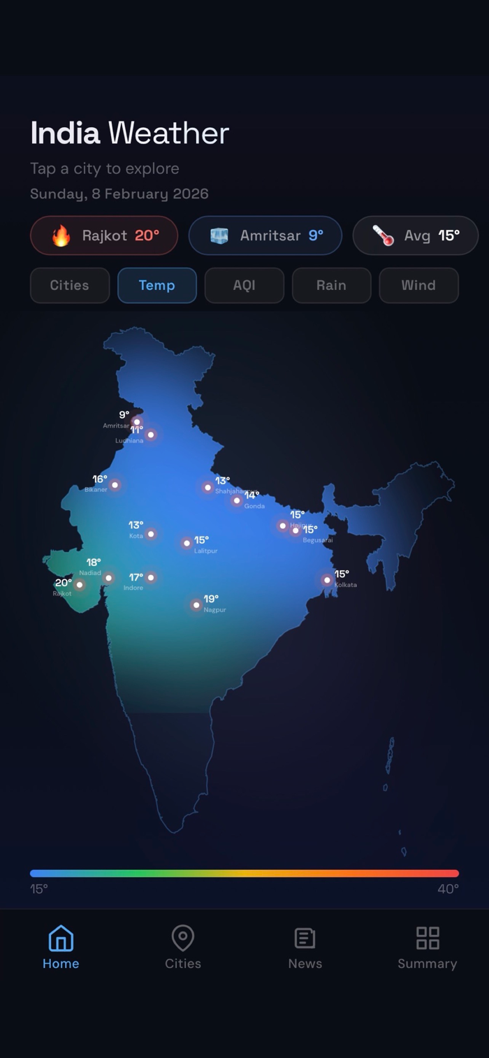 • Real-time temperatures for 14 cities displayed on an interactive India map