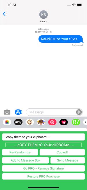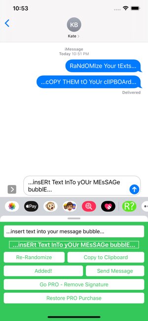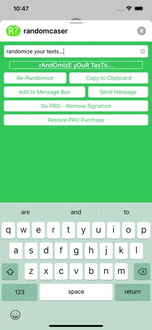 tYpE sOmEtHiNg NoRmAl. gEt SoMeThInG wEiRd. RandomCaser lives right inside iMessage. Type your text, tap to randomize the case, and send it — all without leaving the conversation. HOW IT WORKS Type or paste any text. Tap Re-Randomize until it looks just right (or just wrong enough). Send it directly, drop it in the message box to edit first, or copy it to your clipboard. THREE WAYS TO USE IT Send Message — fires it straight into the chat. Add to Message Box — drops it into the compose field so you can tweak it before sending. Copy to Clipboard — grab it for use anywhere else on your device. GO PRO — ONE PRICE, FOREVER Unlock 5 handcrafted themes with a single purchase. No subscriptions. No ads. Just vibes. THEMES Sage Park — calm, sophisticated greens inspired by a luxury hotel lobby. Beach Claw — warm sand tones with cool ocean blue accents. Royal Purple — bold, regal purple for when you're feeling fancy. Red n Black — high-contrast and unapologetically loud. Robotic — clean, minimal, pure system design. Built with Liquid Glass on iOS 26 for a modern, premium feel. Perfect for roasting your group chat, making a point, or just being chaotic.