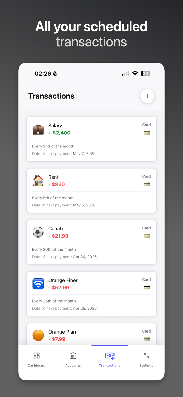 Add transactions that happen once or repeat on a schedule, so your budget reflects real life more accurately.