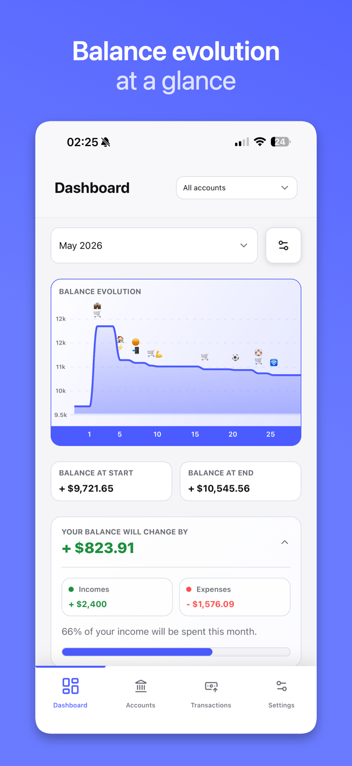 Create your accounts, enter your balances manually, and organize one-time or recurring transactions to build a clear picture of your future cash flow. Whether you want to prepare for rent, salary payments, subscriptions, loan payments, transfers, or irregular expenses, Ampaly helps you anticipate what is coming before it happens.