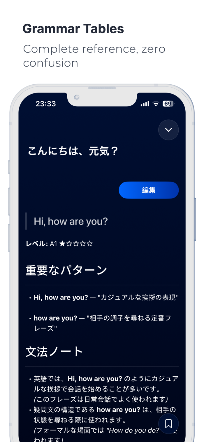 Grammar Tables (PREMIUM) Get complete verb conjugations and grammar forms at a glance. No more guessing — see all forms organized in easy-to-read tables.