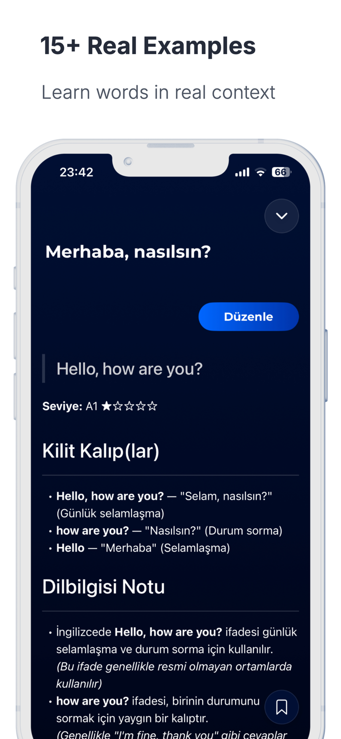 15+ Real Examples (PREMIUM) Don't just get a translation — see how words are actually used by native speakers. Every word comes with 15+ real-world example sentences to help you understand context and usage.