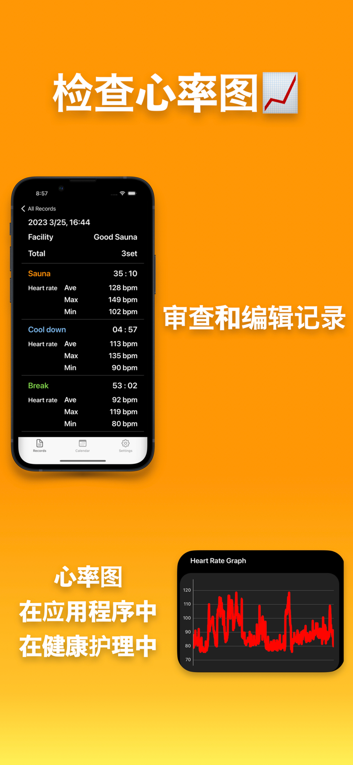《桑拿记录》可让你用Apple Watch记录桑拿浴,记录每组桑拿、水浴及休息的时间、心率与估计出汗量等。具备记录时间心率、保存心率数据到健康护理、显示心率图表、桑拿活动日历、振动通知等功能,还能记录桑拿房设施、注意事项、评价、温度等,可登记喜欢的桑拿浴室,测量体重血压及BMI,记录可在iPhone查看、分享,与HealthKit整合,数值仅供参考,使用时需注意防Apple Watch变热。