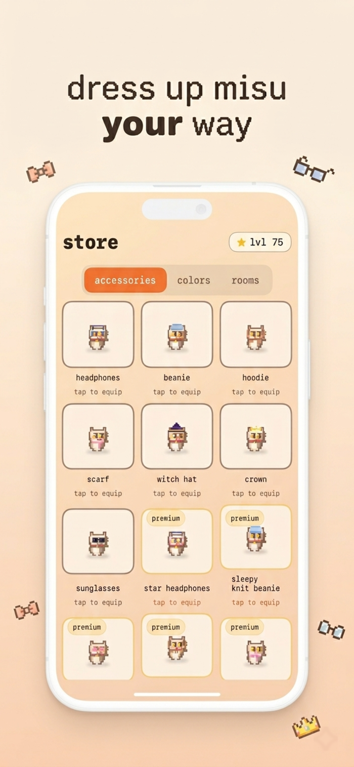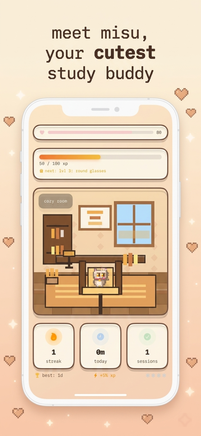 Misu是一款能伴你学习的虚拟宠物。它会随你学习成长,你可设置专注定时器、屏蔽分心应用。看着像素猫从小猫进化成智慧伙伴,通过保持学习连贯性建立连胜、赚取经验值,解锁房间和配饰,让猫 thrive 。更多学习,它更茁壮。使用条款:https://www.apple.com/legal/internet-services/itunes/dev/stdeula/