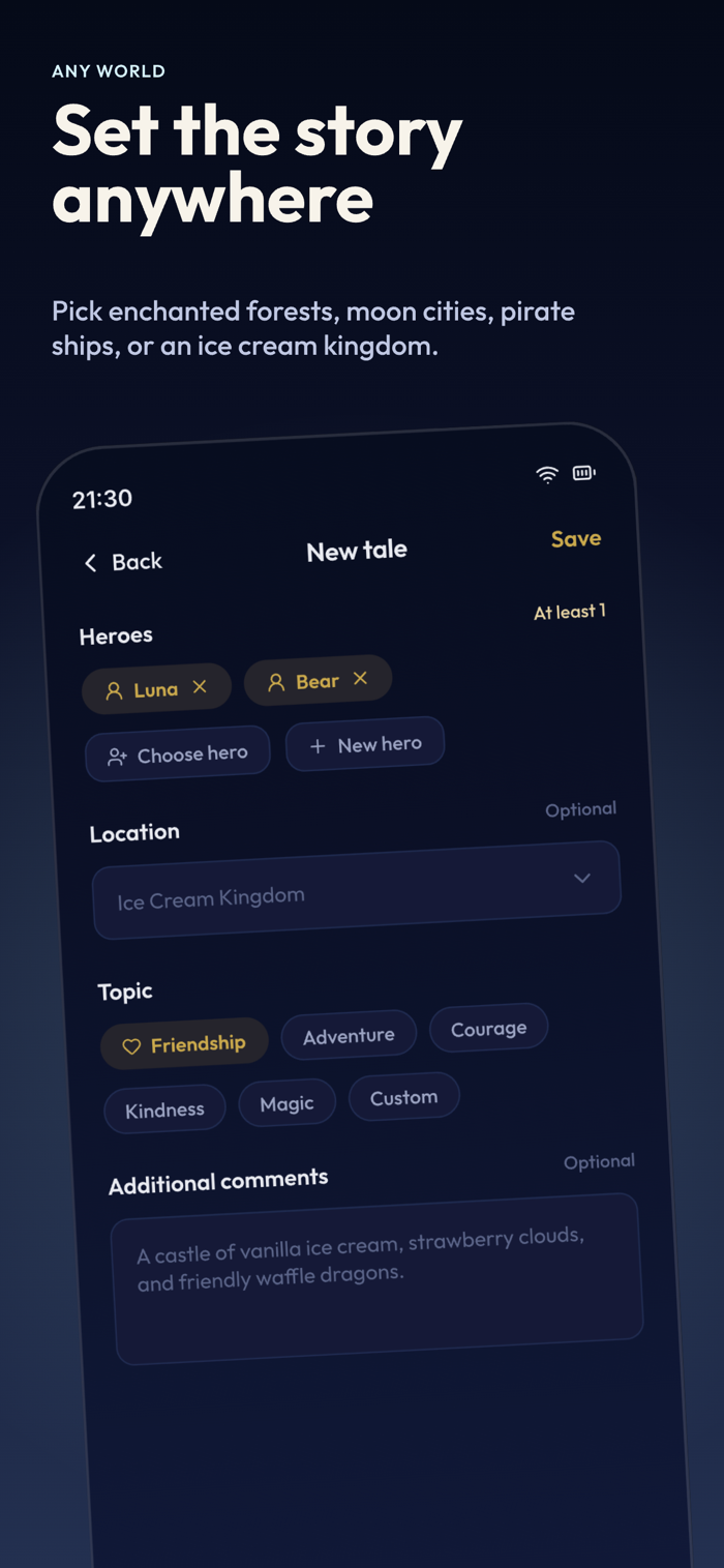 Set the Scene — Choose enchanted forests, moon cities, pirate ships, an ice cream kingdom, or anywhere your imagination goes.