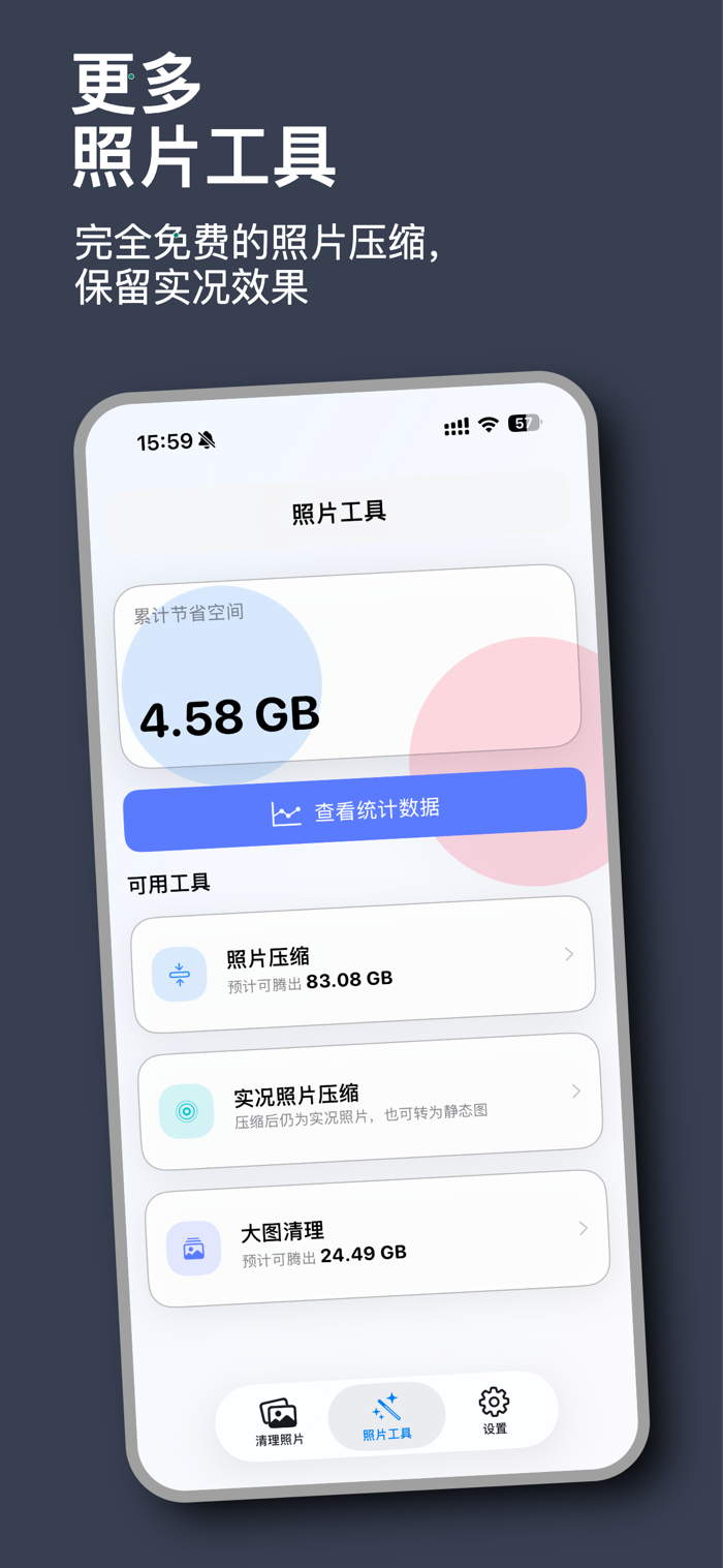 你可以像刷卡片一样快速筛选照片,也可以批量压缩图片、清理大图,并在已归档、暂存区和回收站中统一管理内容。
