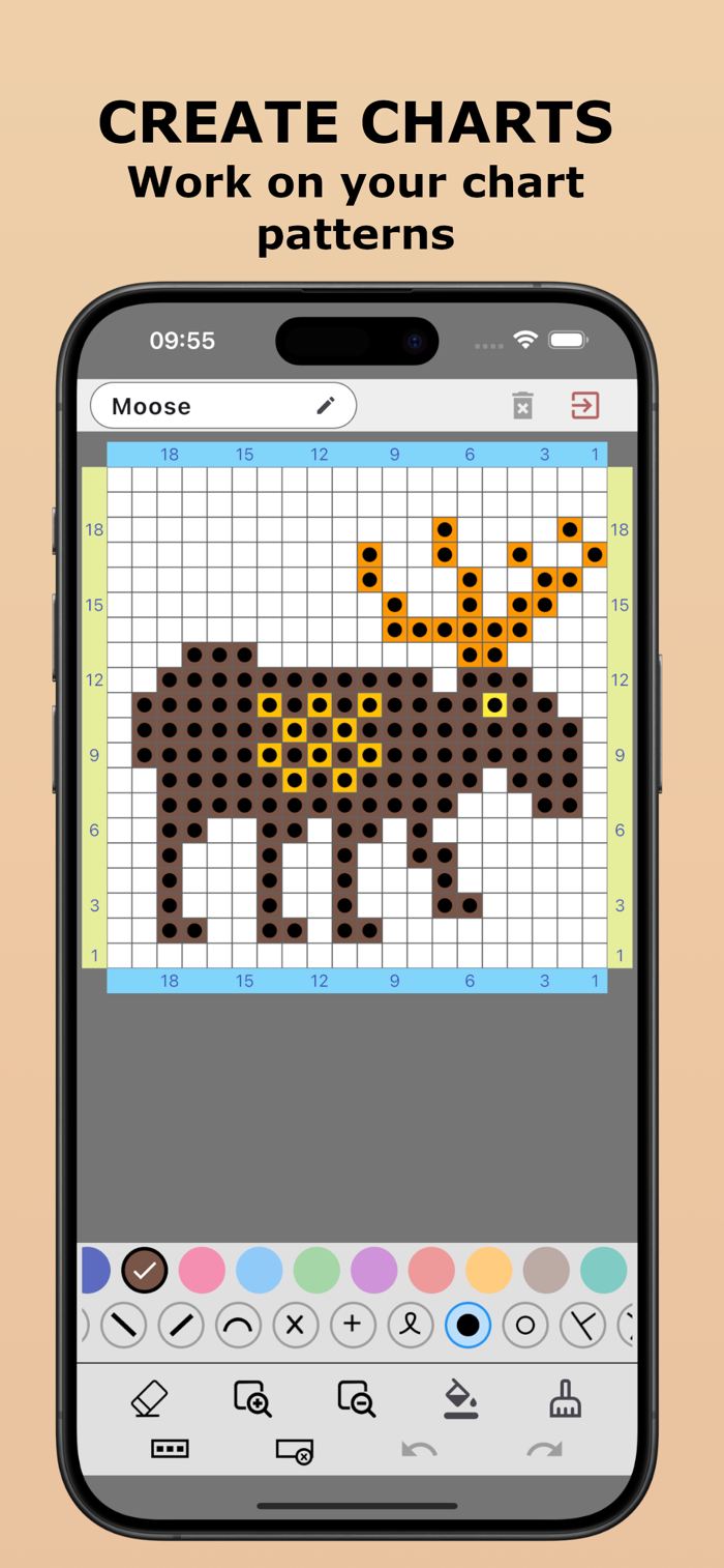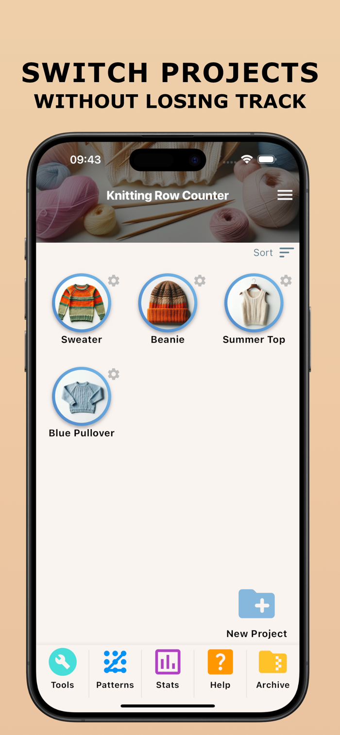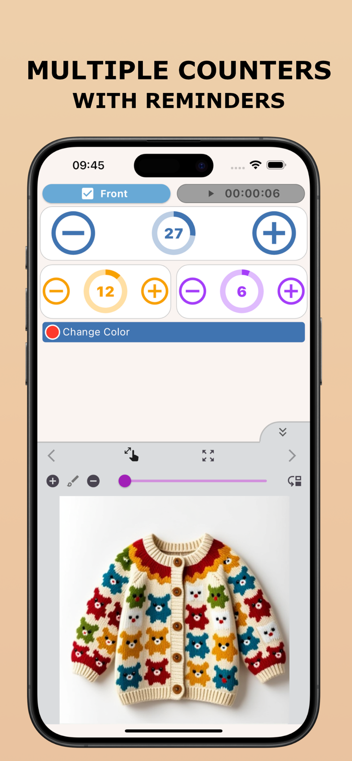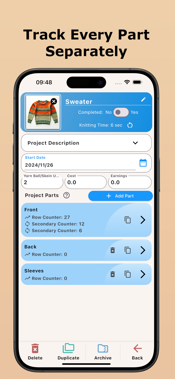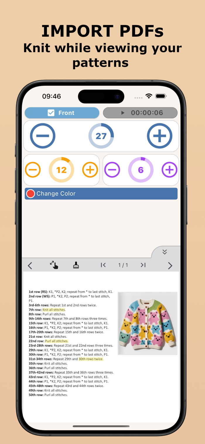 Row counter app for knitting and crochet. It helps you track rows, repeats, and stitches with smart counters, reminders, and project tools. Set up projects, add parts, import pattern images/PDFs, highlight important instructions, add cover images and notes. Add multiple counters per part, use horizontal highlighter on pattern images, set up row counters with secondary ones for color/pattern changes, add reminders, has a built-in timer, pattern designer, dark mode, and helper tools for pattern following/conversion.