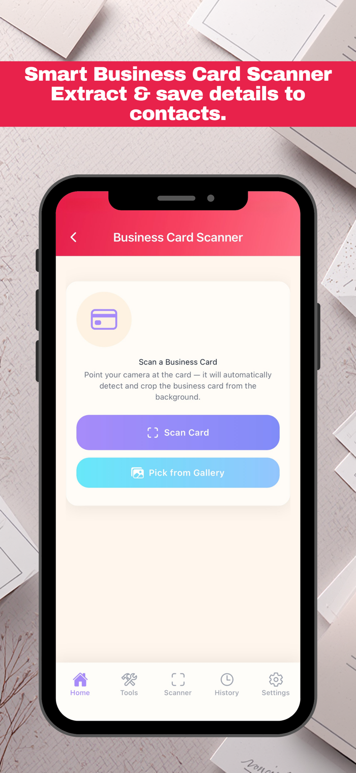 Business Card Scanner — Point your camera at any business card. AI extracts name, company, phone, email, and website — then saves directly to your contacts with one tap.