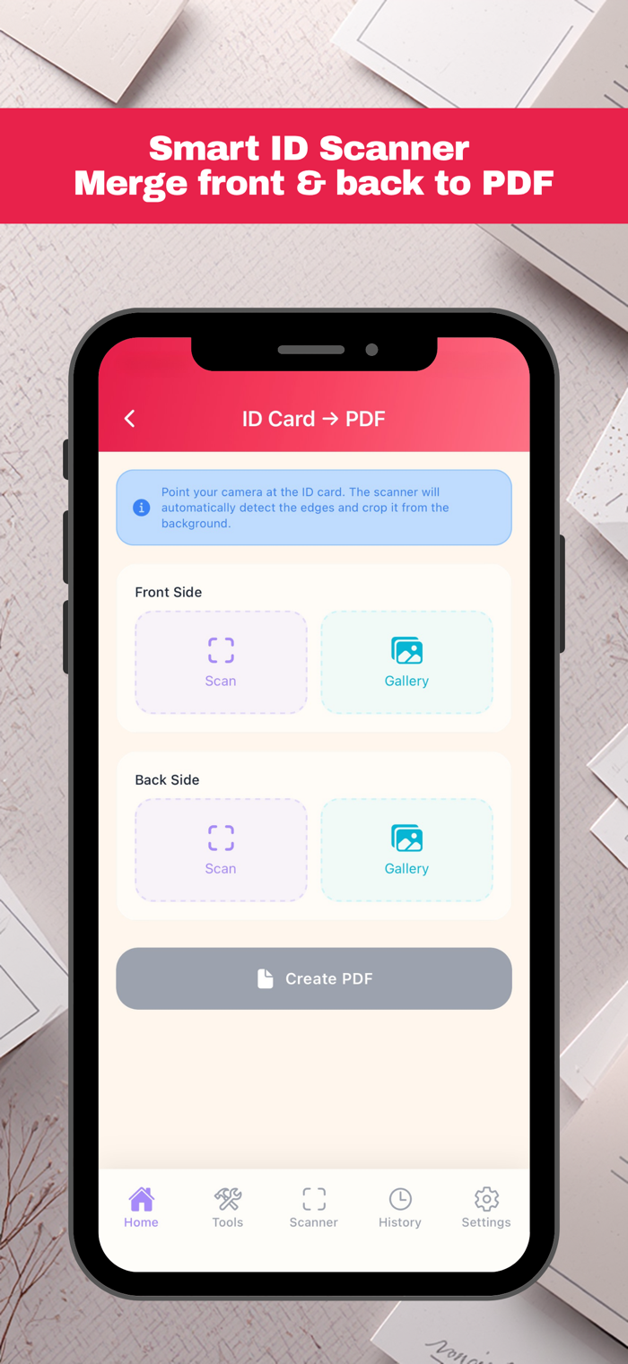 ID Card to PDF — Photograph the front and back of any ID card. Both sides are combined into one clean PDF page with automatic edge detection.