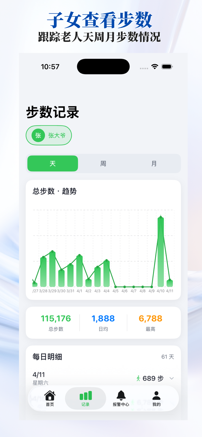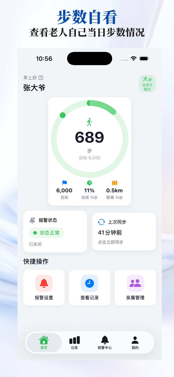 数据同步查看:定时获取老人每日步数及历史健康数据,云端 + 本地双重存储,支持离线查看记录。