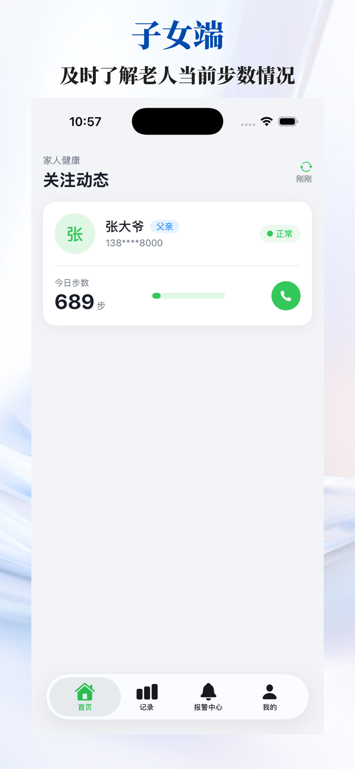 底部导航栏:首页、记录、报警、我的四大模块,零门槛操作。