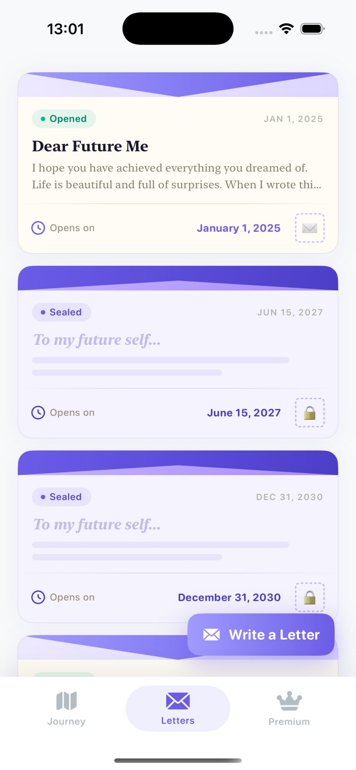 Write a letter, seal it, and set a date. When that day arrives, your letter unlocks — a beautiful message from the past you.