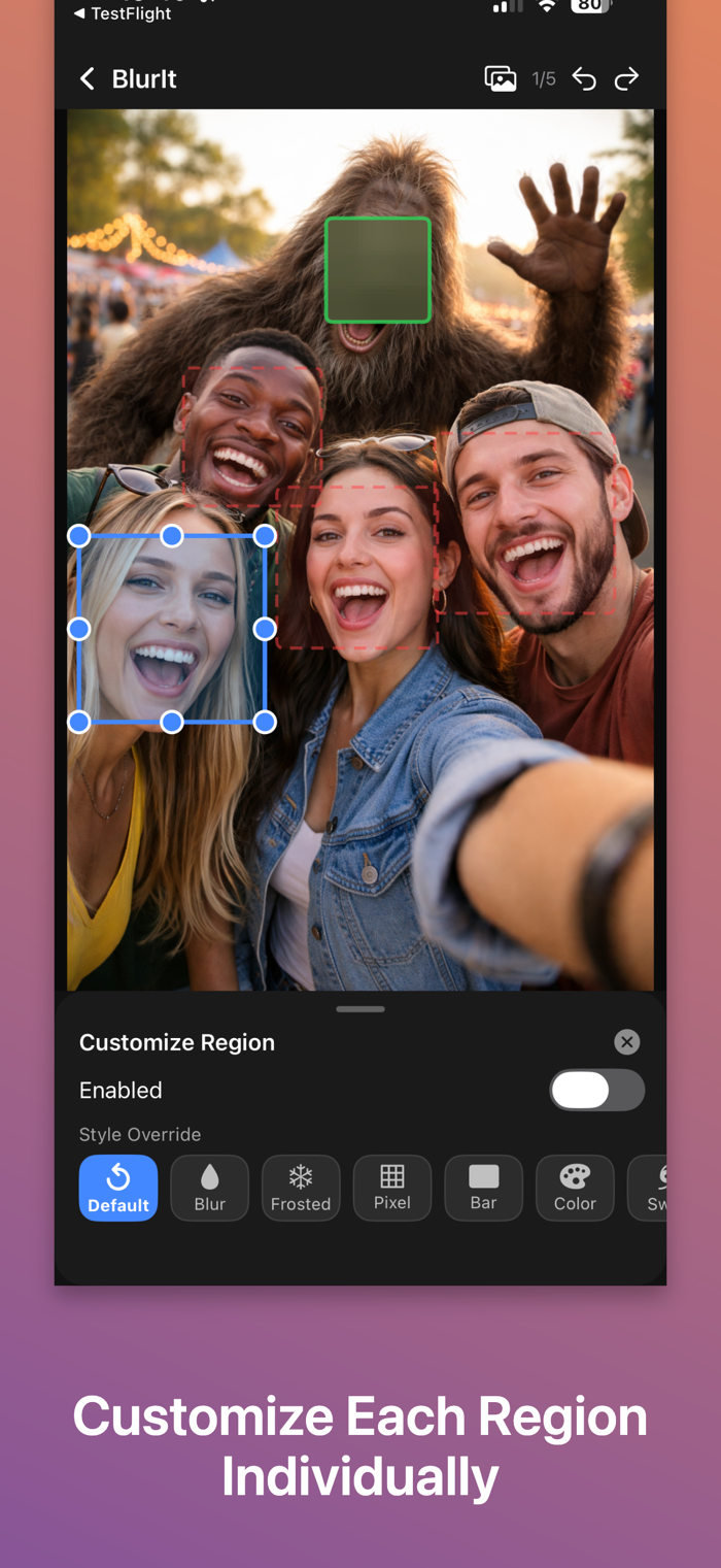 Tap any detected region to customize it individually. Override the global blur style, pick a specific emoji or fill color -- all per region. Resize regions with drag handles for pixel-perfect control.