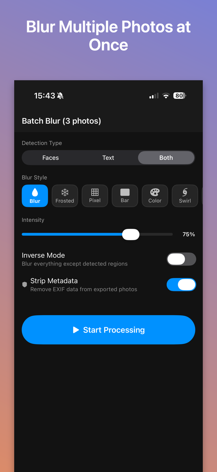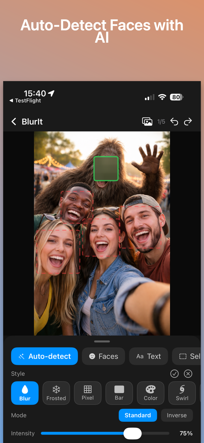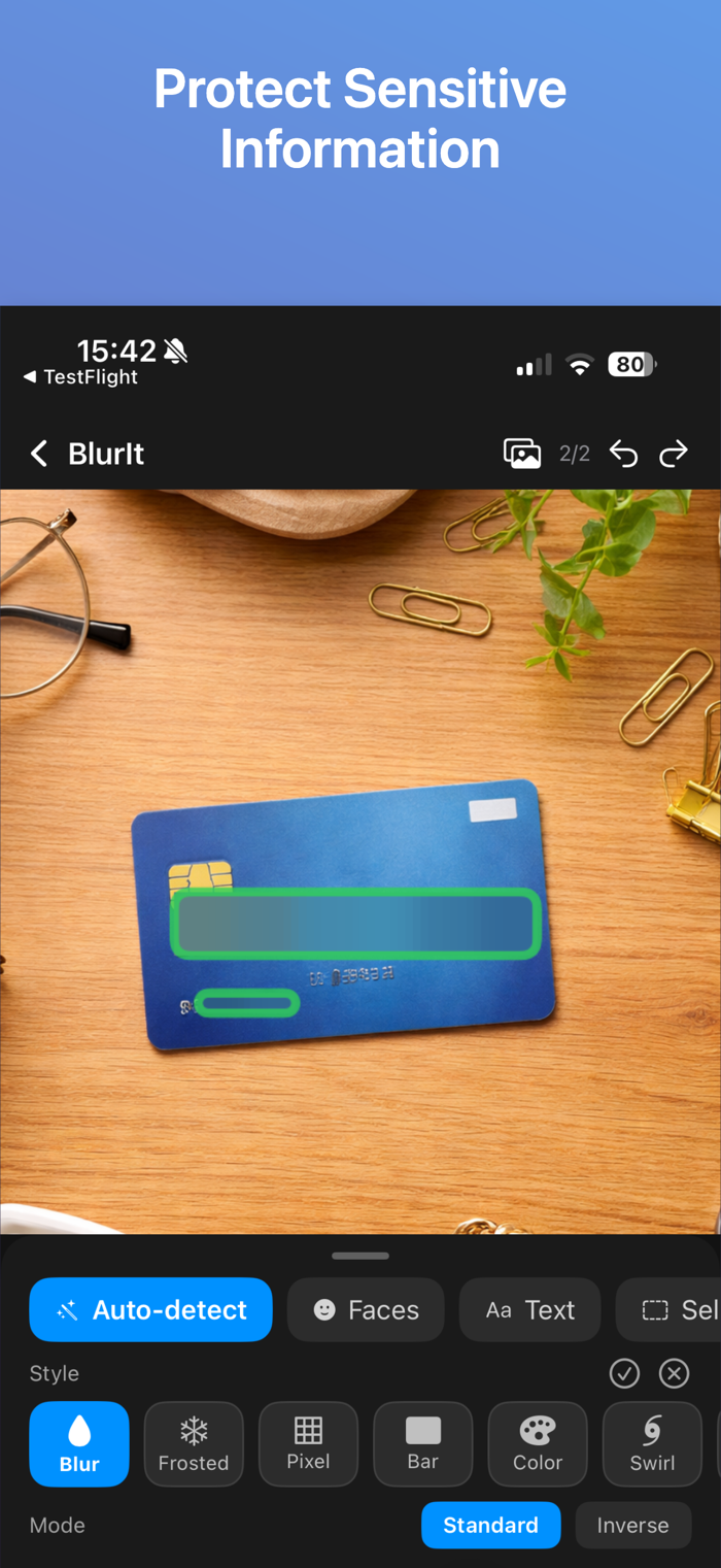 BlurIt uses advanced on-device AI to automatically detect faces and text in your photos. Just open an image and let the app do the work. You can review and adjust every detection before applying.