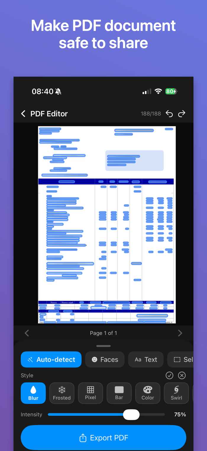 Need to redact a PDF? Open any PDF document, navigate between pages, and blur sensitive content just like you would on a photo. Export the redacted PDF when you are done -- all processed locally on your device.
