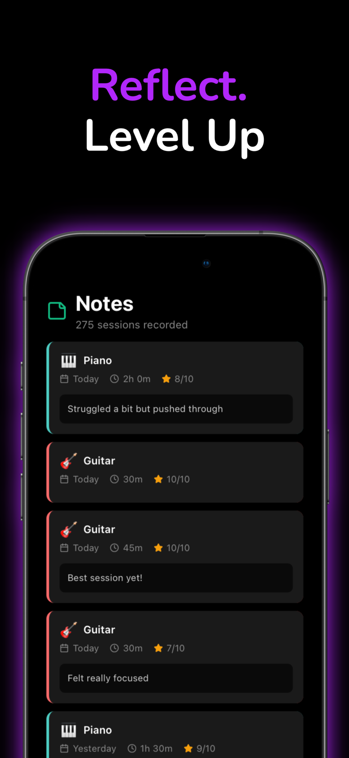 - Post-session reflection: quick 1–3 rating + notes (“What went hard? What sucked? Next improvement?”)
