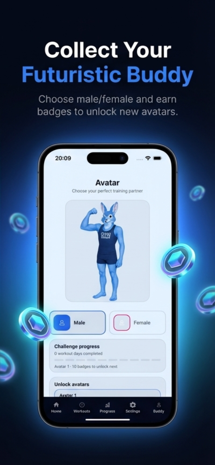 Track sets, reps, and weight with automatic progressive overload logic. When you get stronger, your GymBuddy avatar grows stronger too.