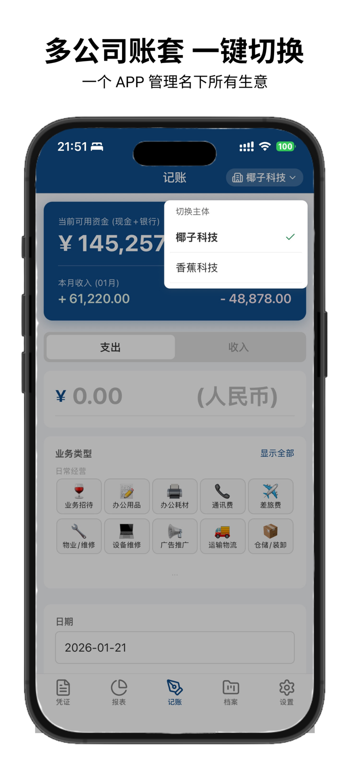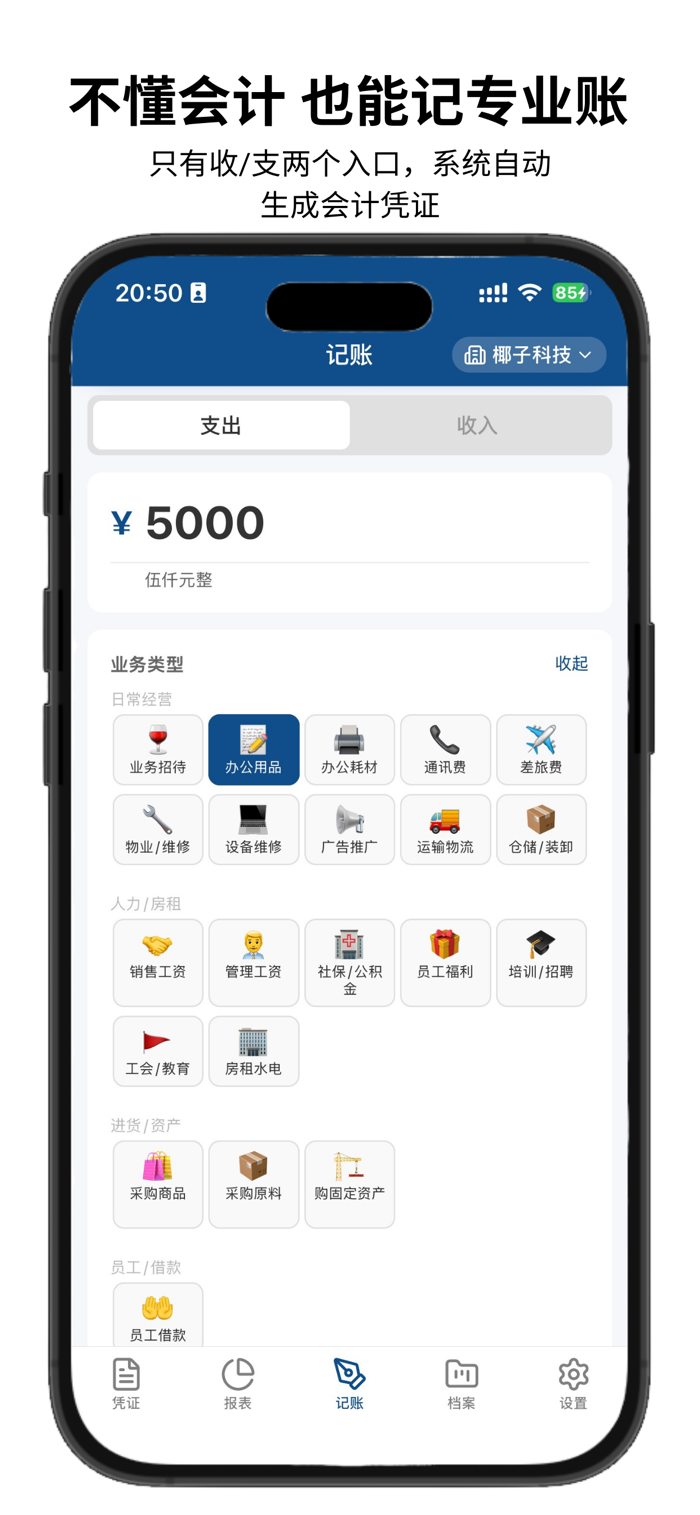 无需懂会计科目,无需懂借贷平衡。选择业务场景(如:销售收入、采购进货、支付房租),填入金额即可。