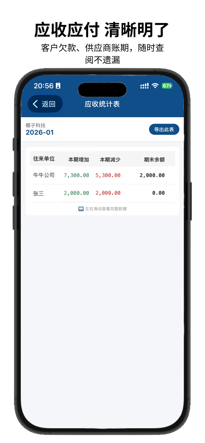 支持导出 Excel/CSV 格式,方便在电脑上二次编辑或打印凭证。