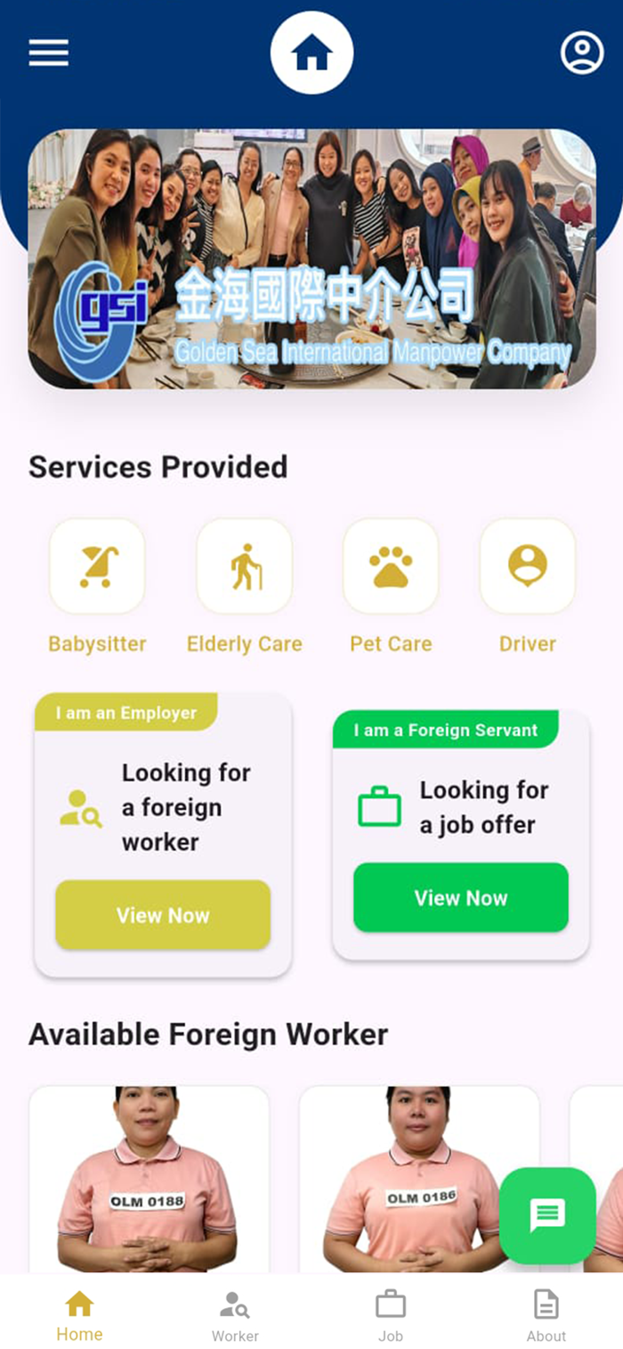 Goldensea提供专业就业服务,雇主可搜索工人、提交用工需求,工人能提交个人简历、搜索工单,还能查看公司简介。