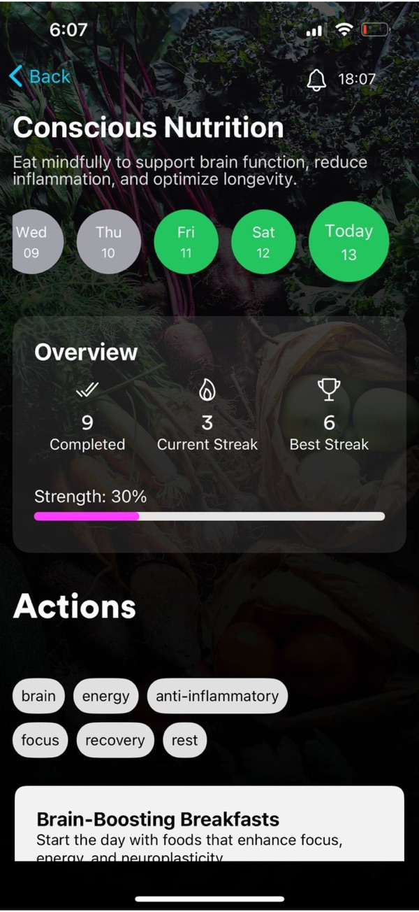 Your brain is unique. Core Neuro Health AI adapts to your goals, routines, and progress with personalized plans that evolve over time — so your habits grow with you.