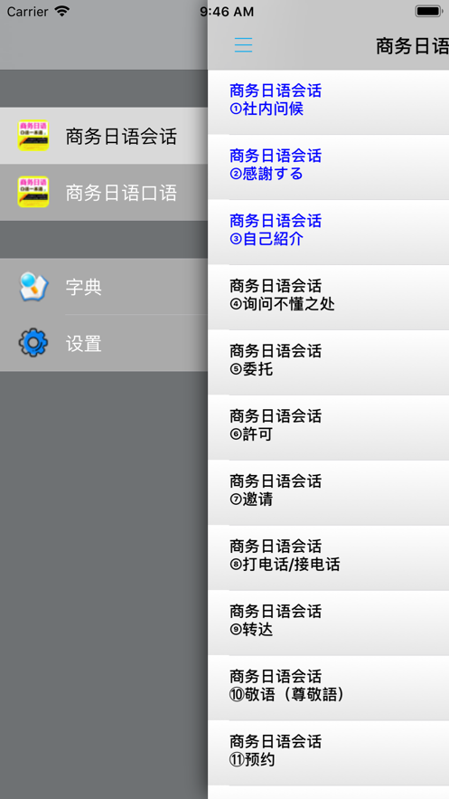 应用内容分为三大篇:社内业务篇、商务交际篇、贸易实务篇。