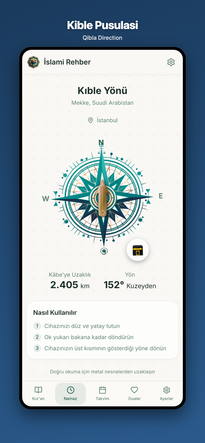 • Precise Qibla direction using GPS and your device compass
