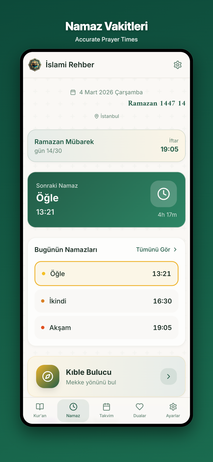 • Accurate prayer times for Fajr, Dhuhr, Asr, Maghrib, and Isha based on your GPS location