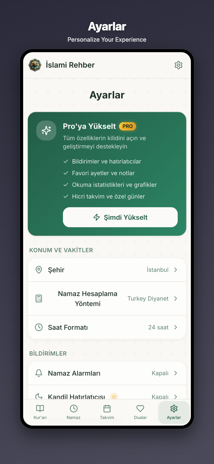 • Special occasion themes for Ramadan, Kandil, and Eid with auto-switch