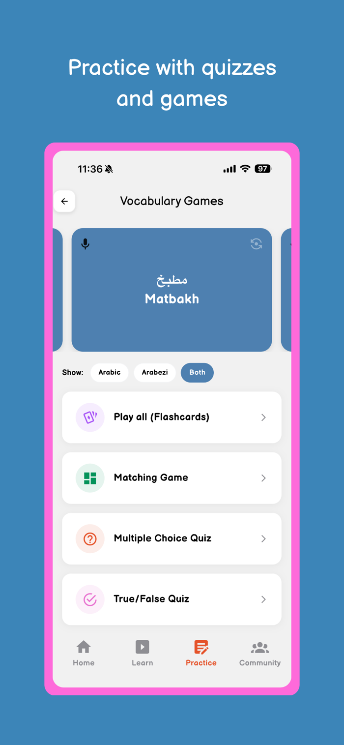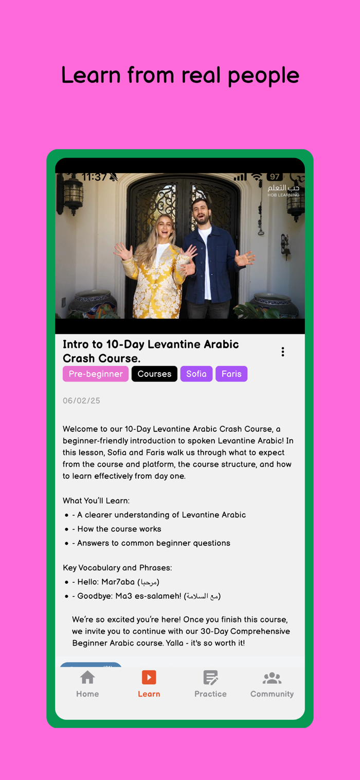 Most apps feel generic and disconnected from how people actually speak. Hob Learning teaches you real spoken Arabic, built for you to understand and respond in real conversations.