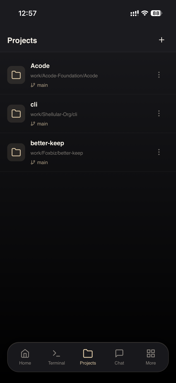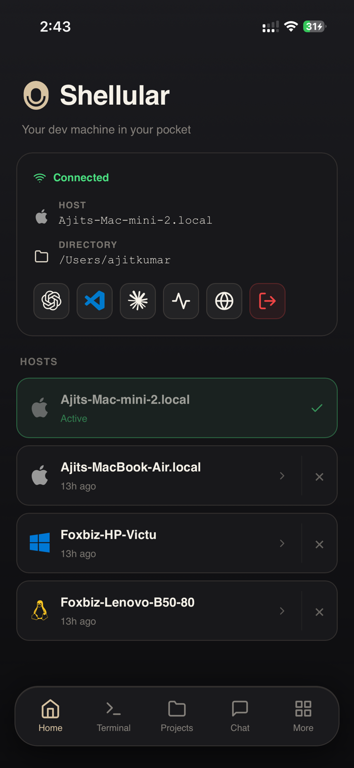 Shellular connects your phone to your development computer over an encrypted connection. Get a full terminal emulator, AI coding agents, a file manager with Git integration, an in-app browser with DevTools, and real-time system monitoring — no SSH setup required. Just scan a QR code.