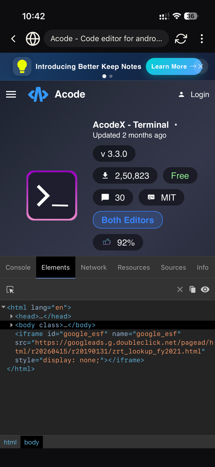 A full development browser with Chrome-like DevTools — inspect elements, view console logs, monitor network requests, and debug DOM issues right on your phone. Disable cache with one tap to always test fresh. No more "works on my machine."