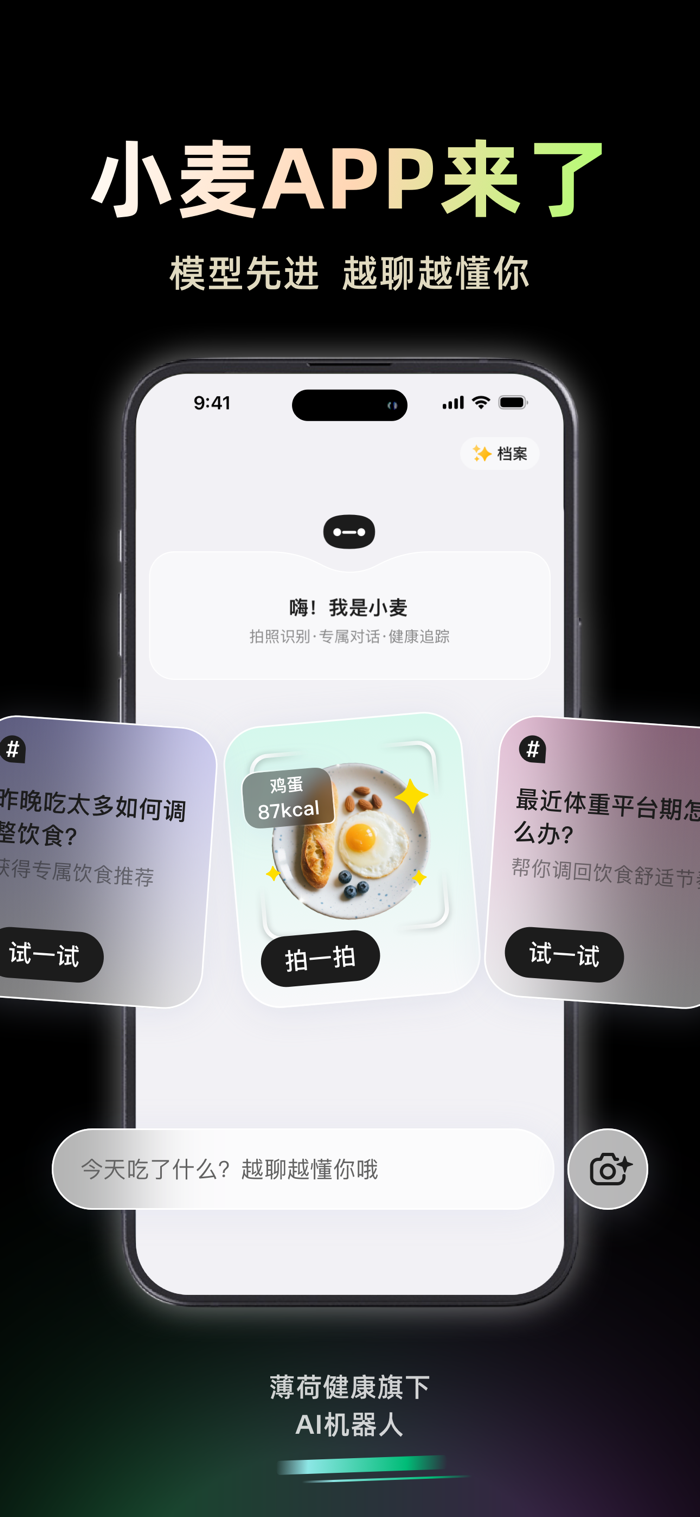 薄荷健康的小麦是新一代AI机器人,专注体重管理与生活健康。它能AI拍照识别食物热量等,提供专属对话规划方案,记录全面健康档案,24小时忠诚陪伴。简单一拍懂所需,围绕健康给支持,记录点滴成记忆,波动愧疚时陪伴,让体重管理和生活健康不再孤单,专业陪伴助力变好。