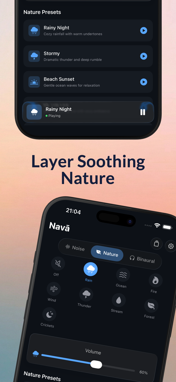 • Sleep Timer — Set it and drift off; Nava fades out gently