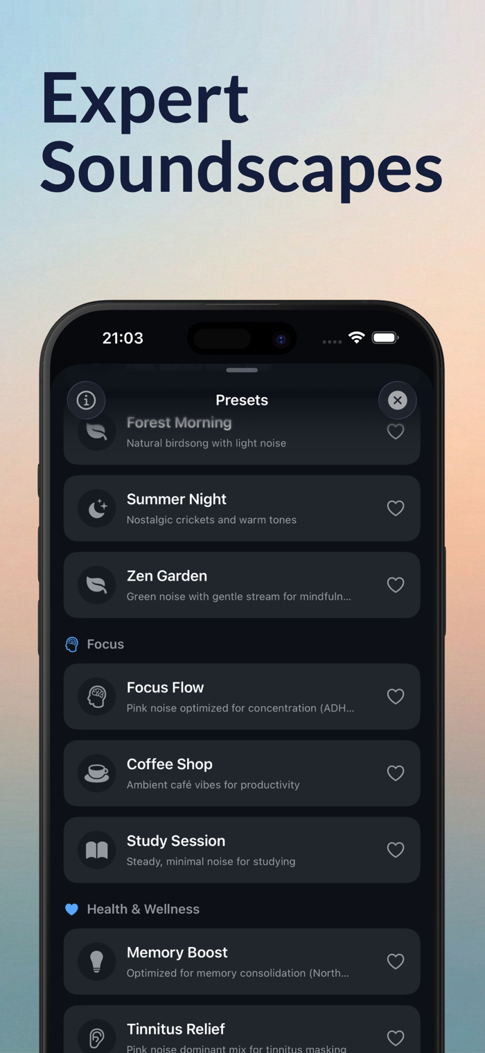 Deep Sleep · Rainy Night · Focus Flow · Calm Anxiety · Tinnitus Relief · Baby Lullaby · Coffee Shop · Beach Sunset · and many more