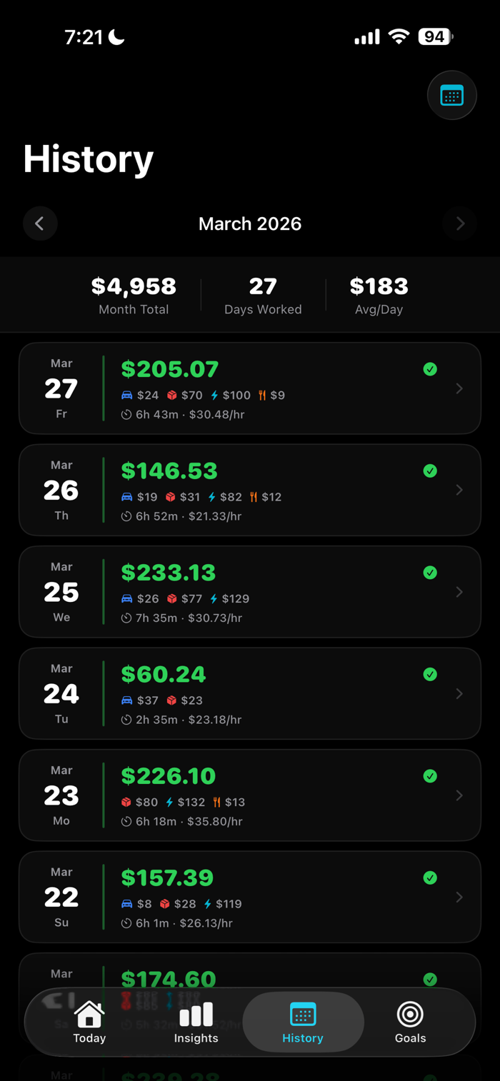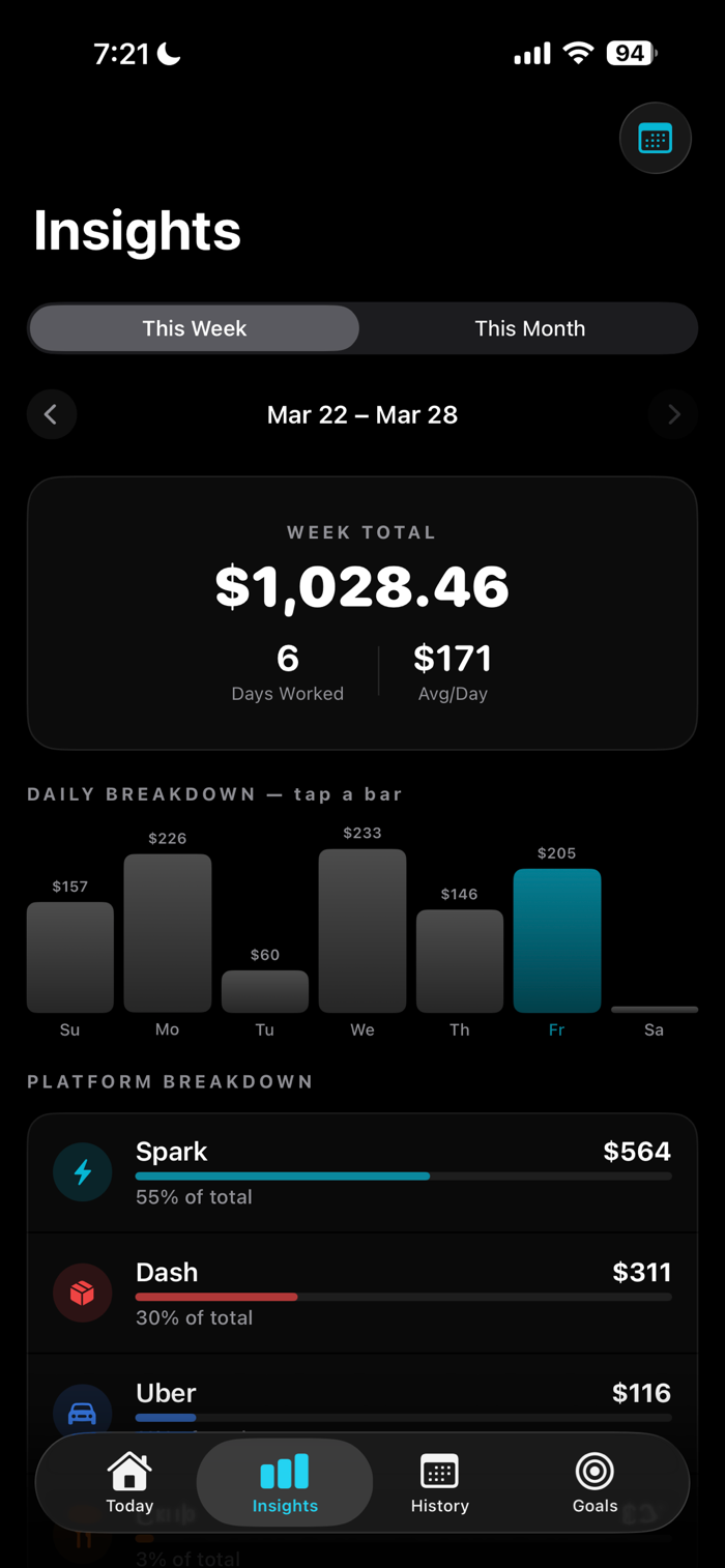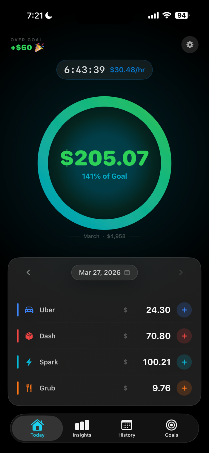 Multi-Platform Dashboard — See your combined earnings from Uber, DoorDash, Grubhub, Spark, and more in one clean view. Add any platform you work for.