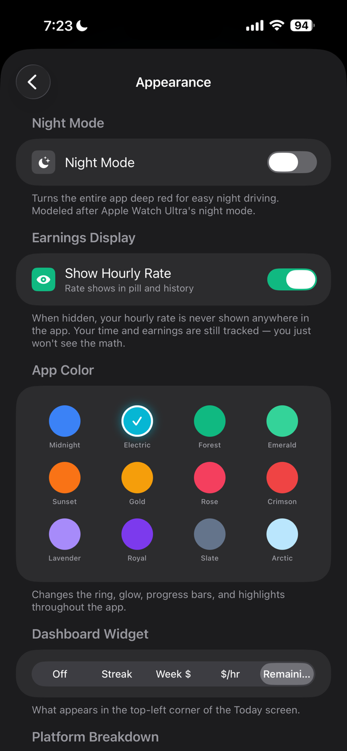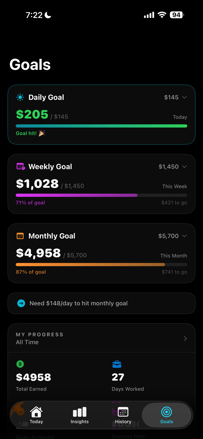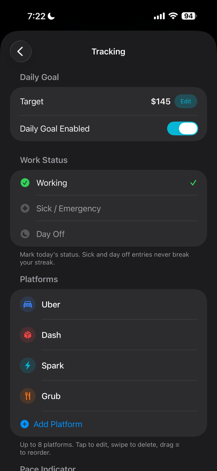 Multi-Platform Dashboard — See your combined earnings from Uber, DoorDash, Grubhub, Spark, and more in one clean view. Add any platform you work for.