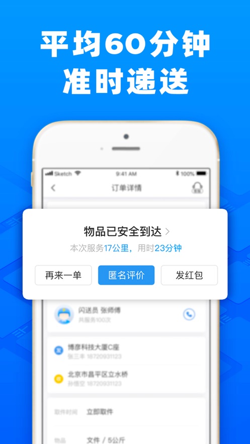 闪送APP下单后,平均1分钟响应、平均10分钟上门、平均60分钟速递全城: