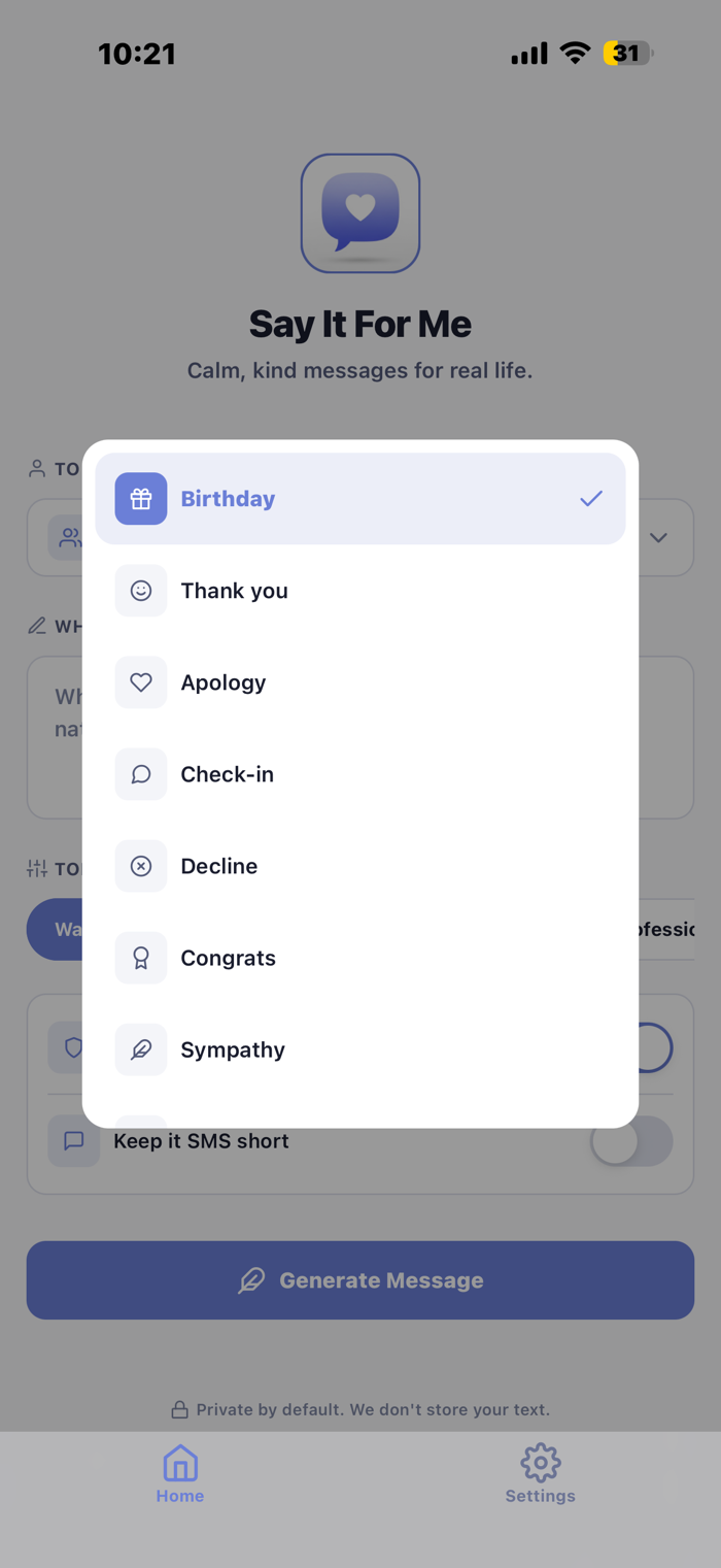 无论你是要感谢母亲、向朋友道歉、与同事联系,还是表达慰问,“帮我说说看”每次都会生成一条完美的信息,根据你的人际关系、场合和偏好的语气量身定制。
