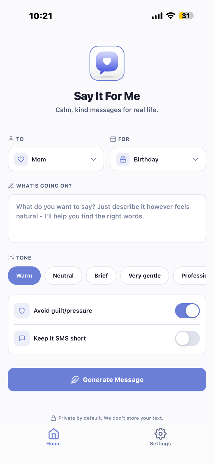 “帮我说说看”是一款沉稳且善解人意的写作助手,能帮你精心撰写贴心的信息,无需过度思考或焦虑。