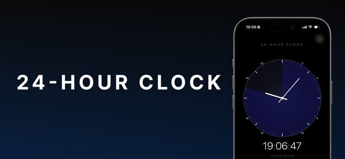 This is a 24-hour clock app. The time is displayed in 24-hour format from 0:00 to 23:59, and the sky color on the screen changes to match sunrise and sunset times. In the morning, it shows a blue sky; in the evening, a sunset; and at night, a dark screen adorned with stars. You can check the time while feeling the flow of the day.