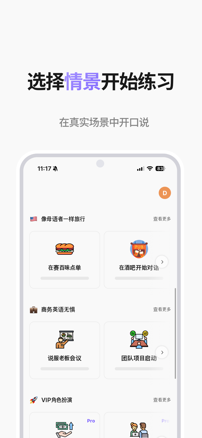 从"在咖啡厅点餐"、"介绍我的工作"等各种情况中选择想要的情况,可以作为真实顾客用目标学习语言练习点餐。