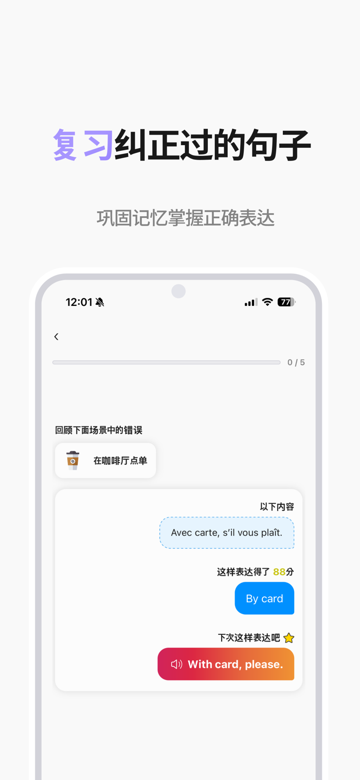 提供练习功能,让您重复练习直到完美掌握所有被纠正的句子。
