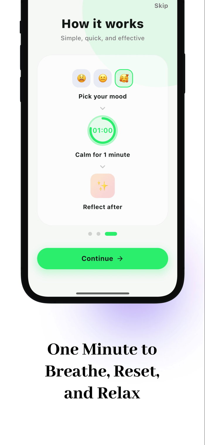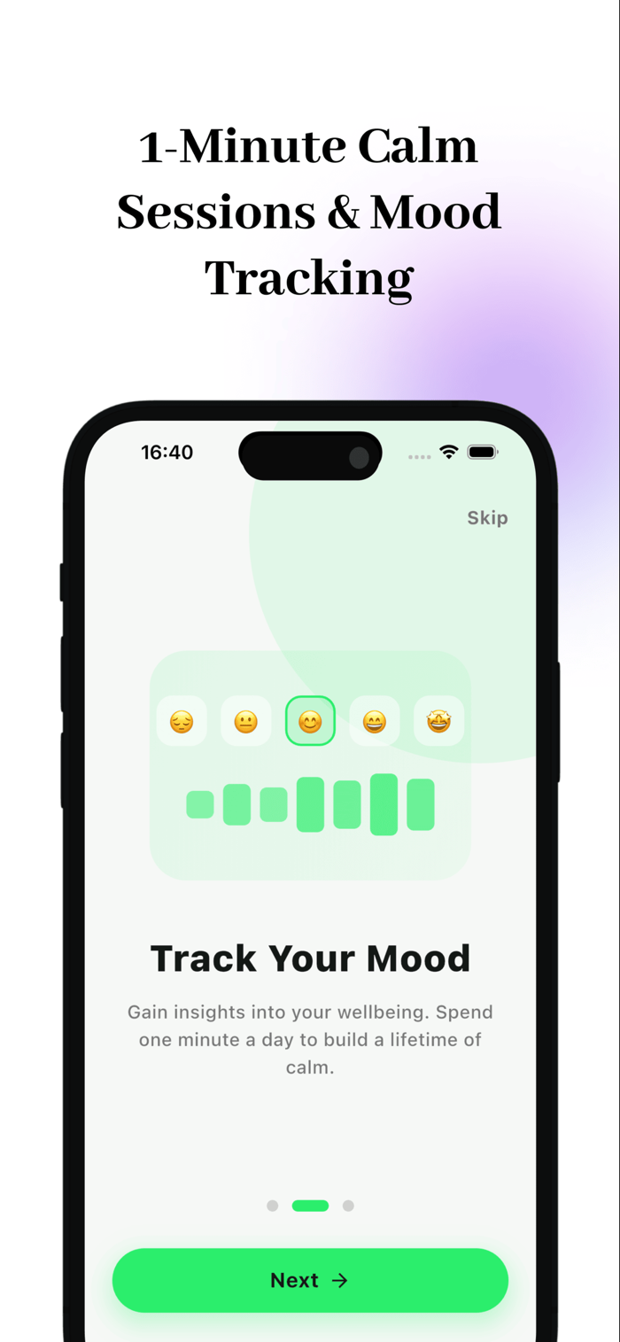 1 Minute Calm助您在短短一分钟内放慢节奏、重归平静。它提供一分钟引导式平静以即时缓解,可选择冥想用的舒缓背景音,有轻柔寺庙钟声或木铎声,还有轻柔呼吸与正念提示,能追踪情绪。支持离线使用,有轻柔环境音乐、自然音效等,声音精心平衡不扰人,可调节音量、有无语音引导,能助您平息焦虑、减轻压力、集中思绪。