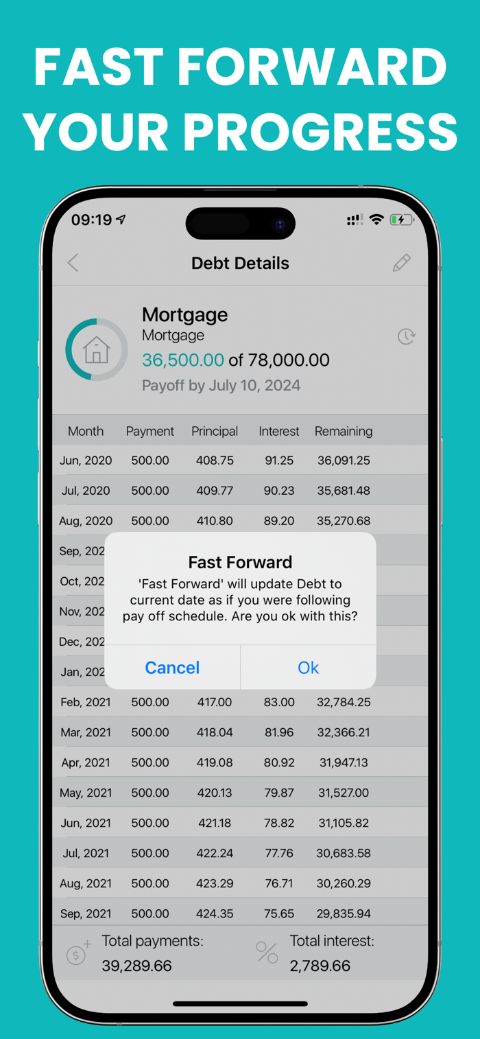 - Fast forward allows app to update your debt to current status as if you were following initial plan