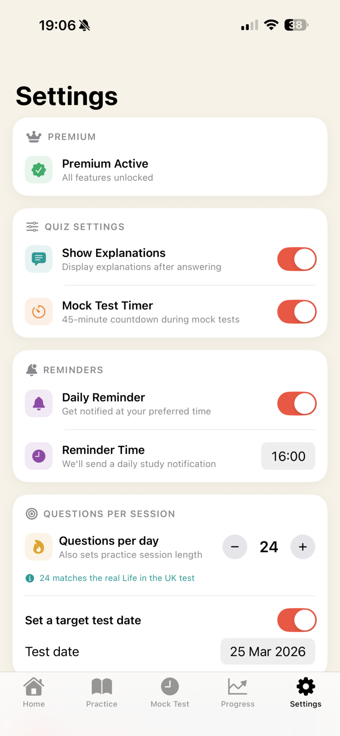 英国生活备考应用程序可帮助您自信地准备英国生活测试。它提供900多道练习题、限时模拟测试、即时答案解析、按主题的进度洞察、每日学习提醒以及灵活的目标。高级解锁功能提供复习错题模式、书签、学习笔记、成绩跟踪和更深入的分析。无论您是从零开始还是复习,它都有助于建立连贯性并更快提高。独立开发,与英国政府无关。