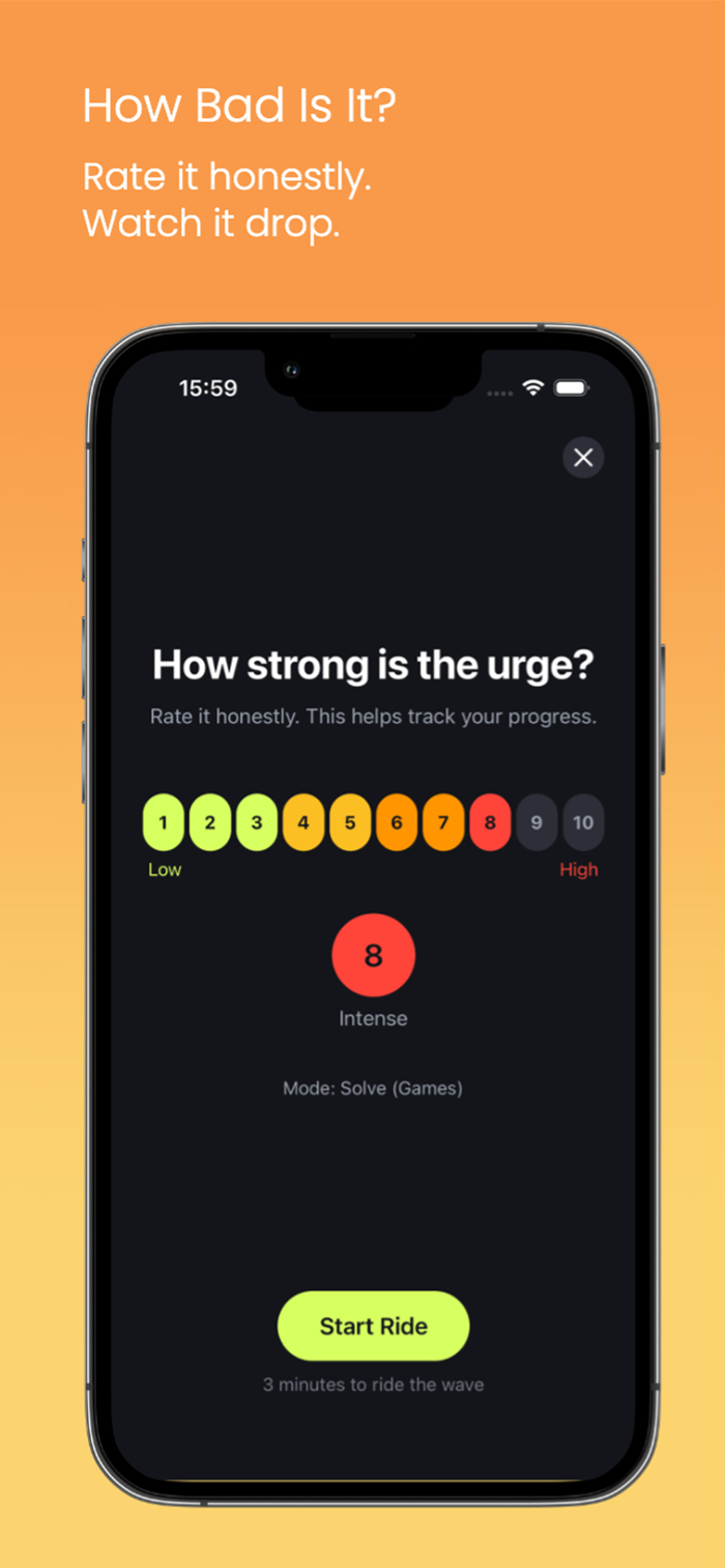 Urges typically peak and fade within 3-5 minutes. Ride The Urge gives you tools to wait it out instead of acting on impulse.