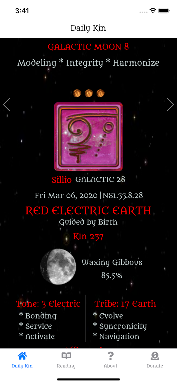 When you open the app, it shows all information for each day's Kin, which is a unique and special day in the 13 moon calendar. Especially powerful is the beautiful Solar Tribe symbol displayed for each Kin. The current moon phase is shown, and even a daily reading! You can swipe the screen to see previous and future Kin's, and the About tab will break down each day's Kin and explain the information thoroughly.