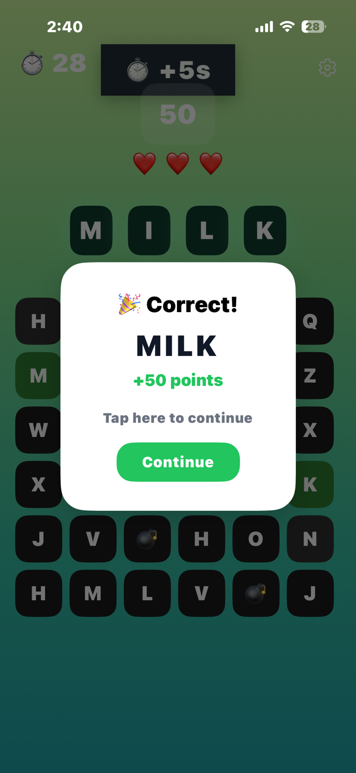 WordMine Quest is a fast-paced word puzzle game that puts your vocabulary and strategy to the test. Find the hidden word by tapping letters on the grid — but be careful. Some tiles hide mines, and one wrong move can cost you a life.