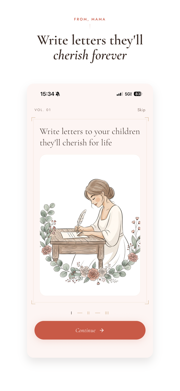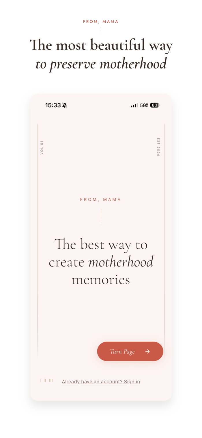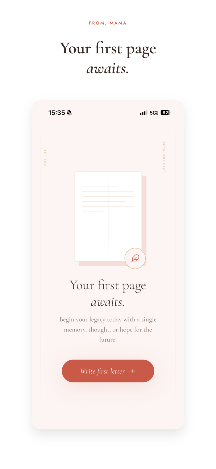 From, Mama is designed to feel like opening a beloved journal. Warm, unhurried, and deeply personal. No noise. No feed. No distraction. Just you, your words, and the children you love.